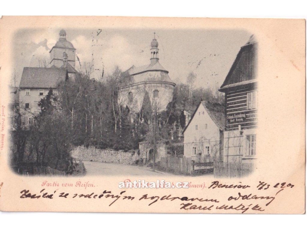 Bensen. Benešov - kostel Narození Panny Marie a kapli Panny Marie Bolestné v Benešově nad Ploučnicí. Technika světlotisk. Vydal Preiss Josef, Bensen, 1901.