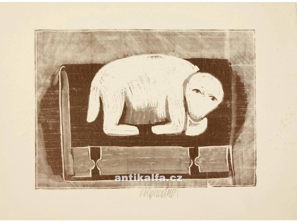 Beránek. Autor Komárek Vladimír. Signovaný dřevoryt.
