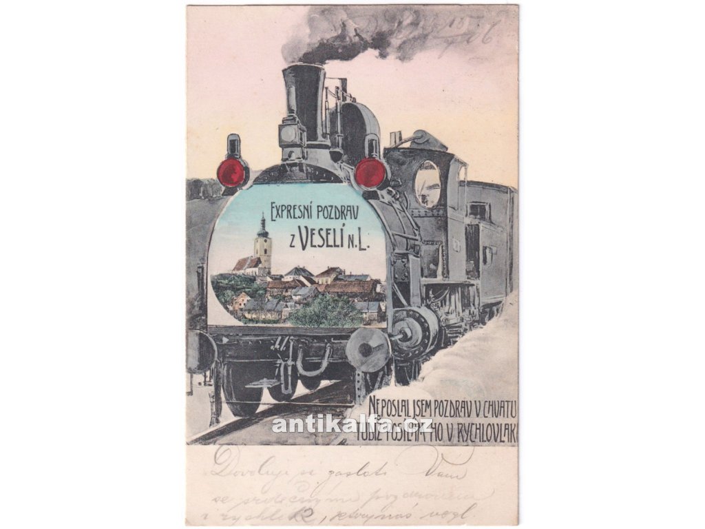 Expresní pozdrav z Veselí nad Lužnicí. Technika kolorovaná litografie. Vydal Vodrážka A. F., Veselí nad Lužnicí, 1901.