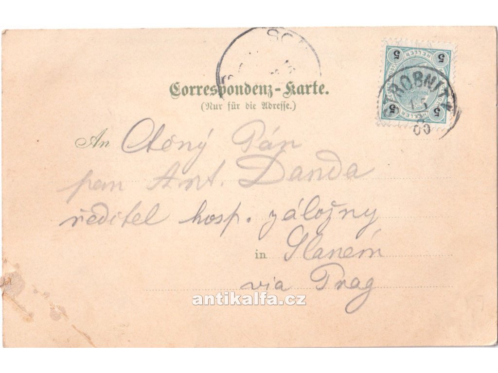 Gruss aus Brünnl. Dobrá Voda u Horní Stropnice (Brünnl) v jižních Čechách. Technika kolorovaná litografie. Vydal XXX, 1901.