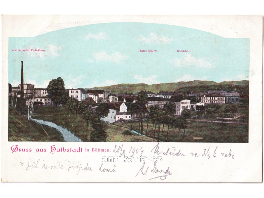 Meziměstí, okres Náchod. Gruss aus Halbstadt. Pozdrav z Halbstadtu v Čechách. Technika ofset. Vydal Wenzel F., Braunau, 1904.