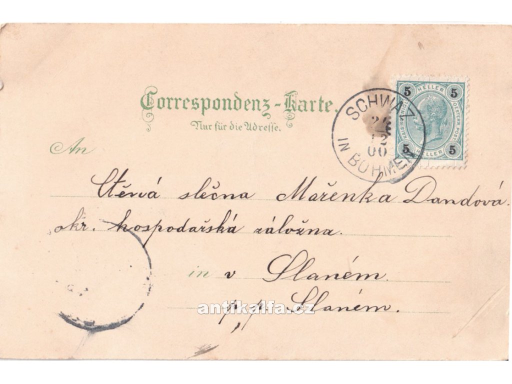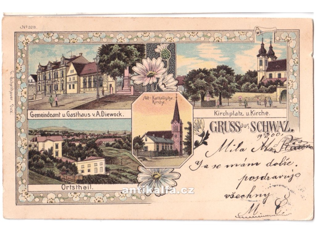 Gruss aus Schwaz.Gemeindeamt u. Gasthaus v. A. Diewock (Obecní úřad a hostinec A. Diewocka) a Kirchplatz u. Kirche (Kostelní náměstí a kostel).. Technika kolorovaná litografie. Vydal Scheithauer G., Dux, 1905.