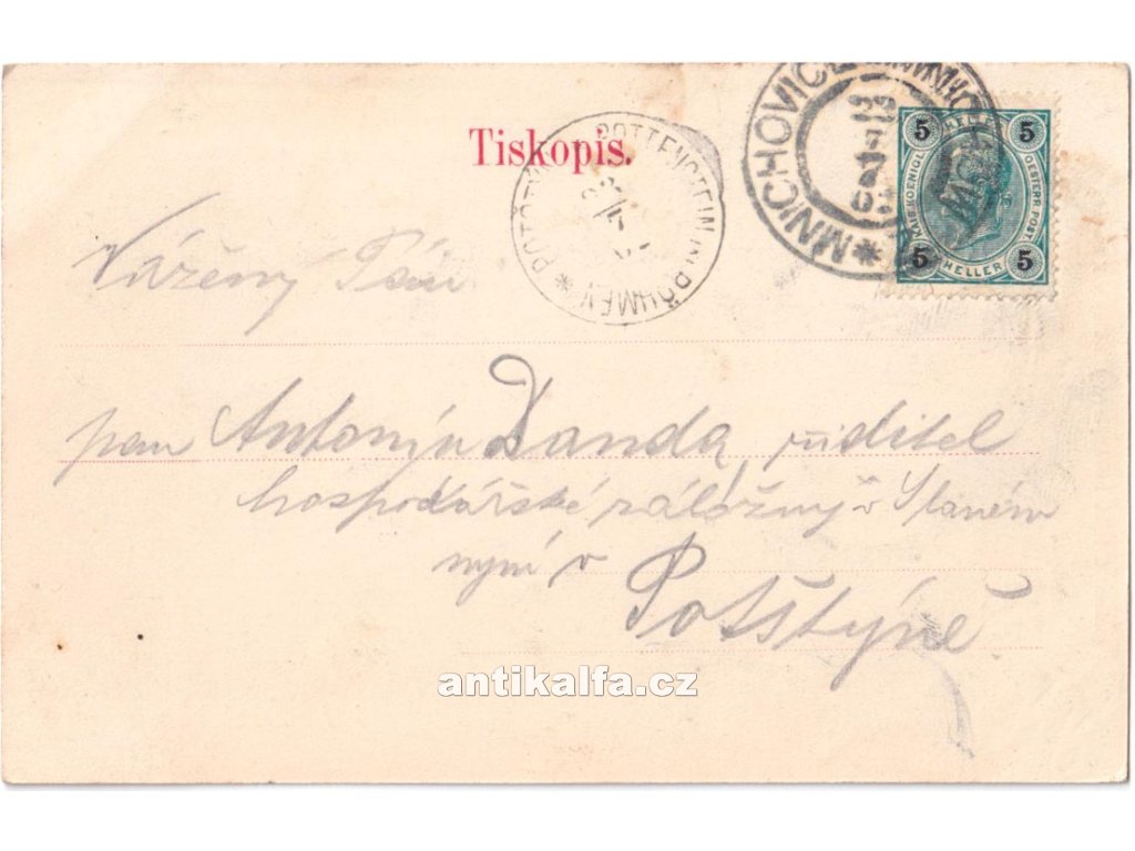 Hotel a Šimkova villa v Hrušově. Technika kolorovaná litografie. Vydal Kaška J.Kolín, 1902.
