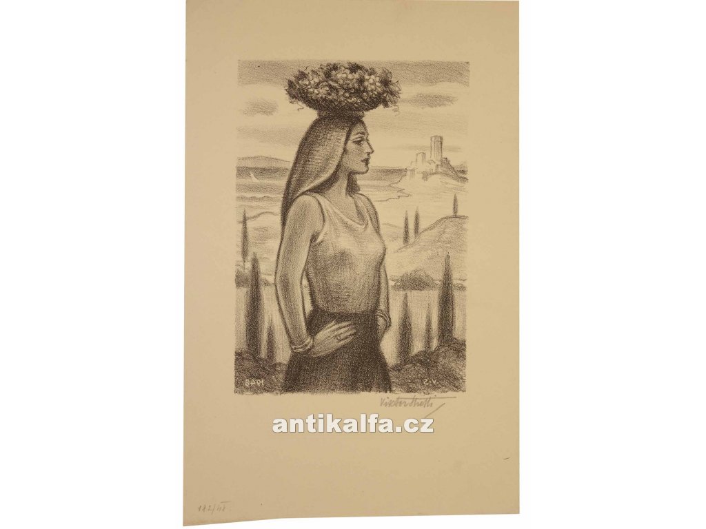 Italka s košíkem hroznů. Autor Stretti Viktor. Signovaná litografie.