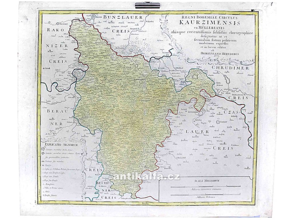 Regni Bohemiae circulus Kaurzimensis. Kouřim. Autor Müller Christoph Johann. Vydal Homannianis Heredibus 1773.
