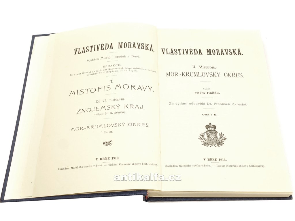 Vlastivěda moravská. II, Místopis Moravy. Díl VI místopisu, Znojemský kraj. Čís. 34, Mor.-Krumlovský okres. Napsal Haňák Vilém. Vydal Musejní spolek, Brno 1913.