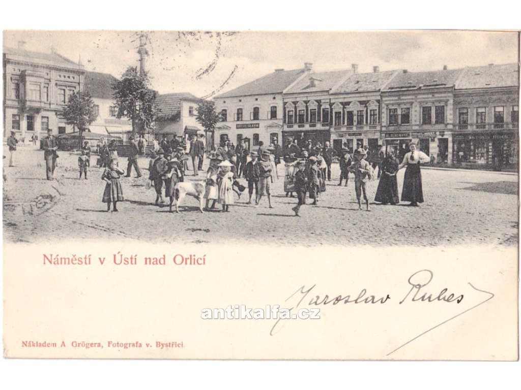 Náměstí v ústí nad Orlicí. Technika světlotisk. Vydal Gröger A., Bystřice, 1900.