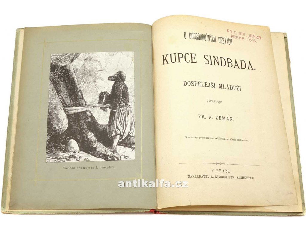 O dobrodružných cestách kupce Sindbada. Autor Zeman Antonín František. Ilustrace Bellmann Karel. Vydal Storch A. syn, Praha 1882.