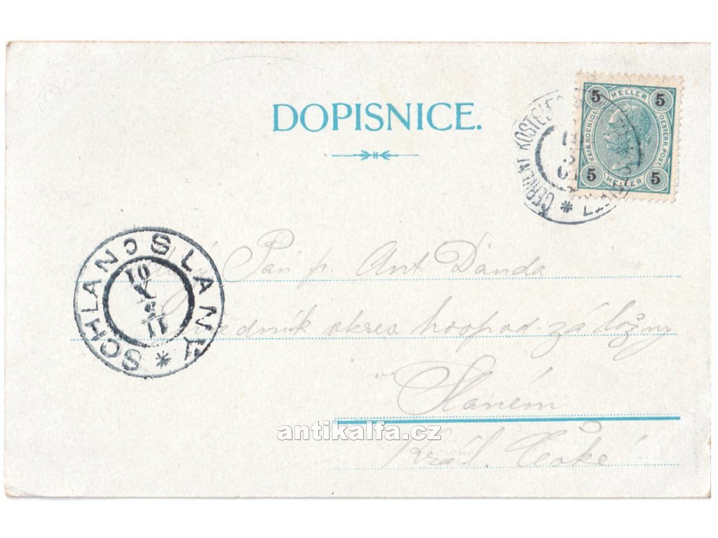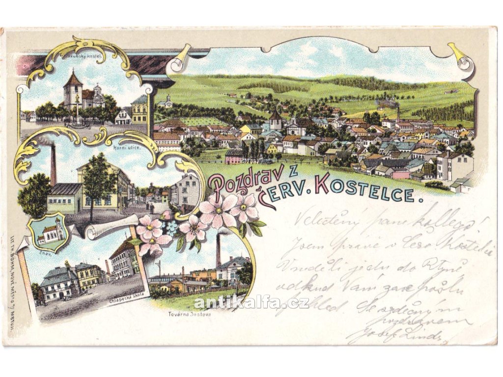 Pozdrav z Červ. Kostelce. Technika kolorovaná litografie. Vydal Böhm Theodor, Nové Město nad Metují, 1901.