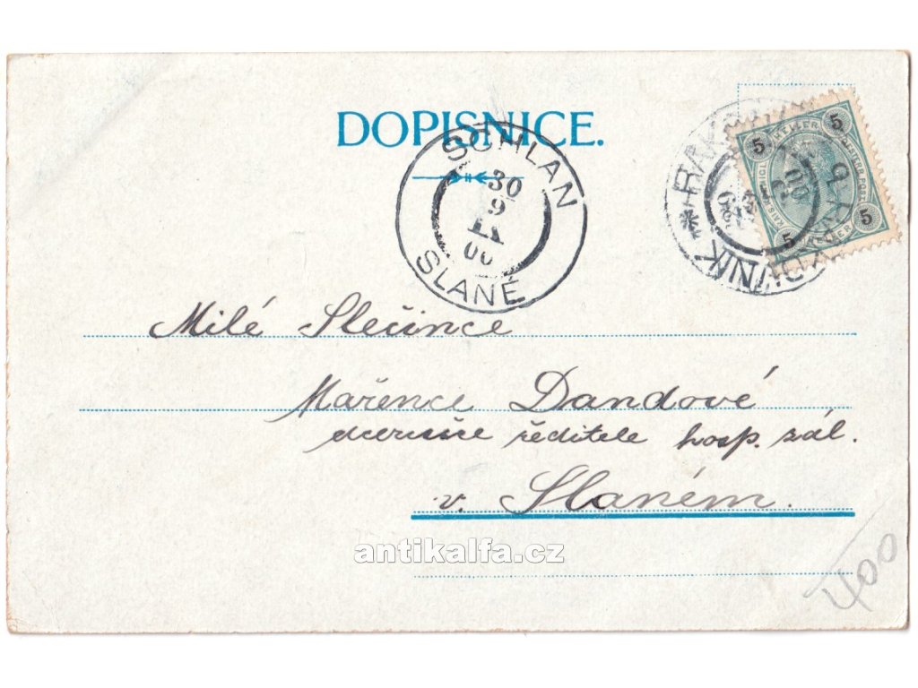Pozdrav z chmelařského města Rakovníka. Technika kolorovaná litografie. Vydal Böhm Theodor, Nové Město nad Metují, 1900.