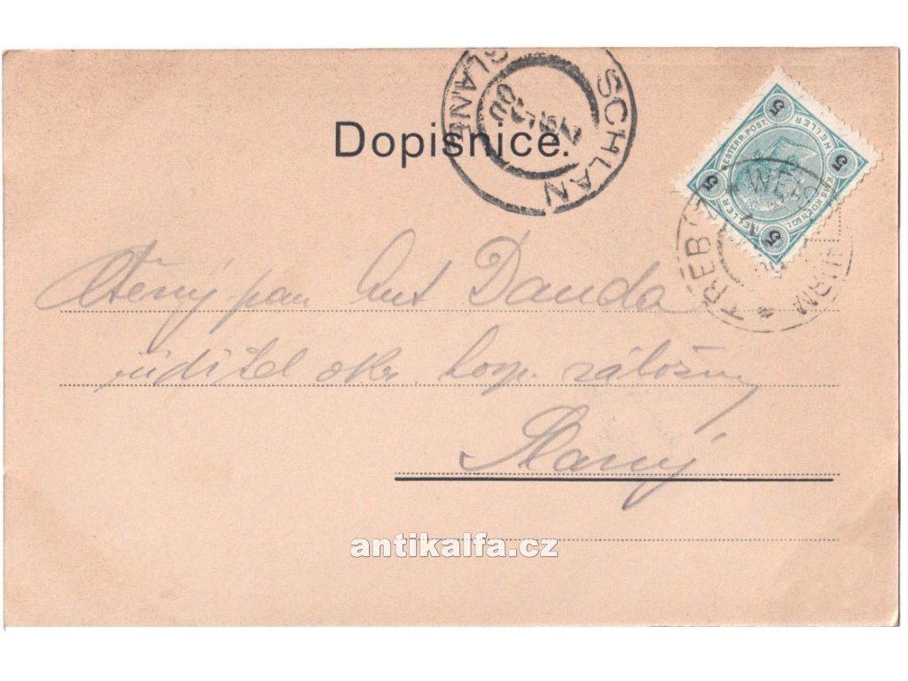 Pozdrav z Horešovic. Technika světlotisk. Vydal Jeřábek, Slaný, 1900.