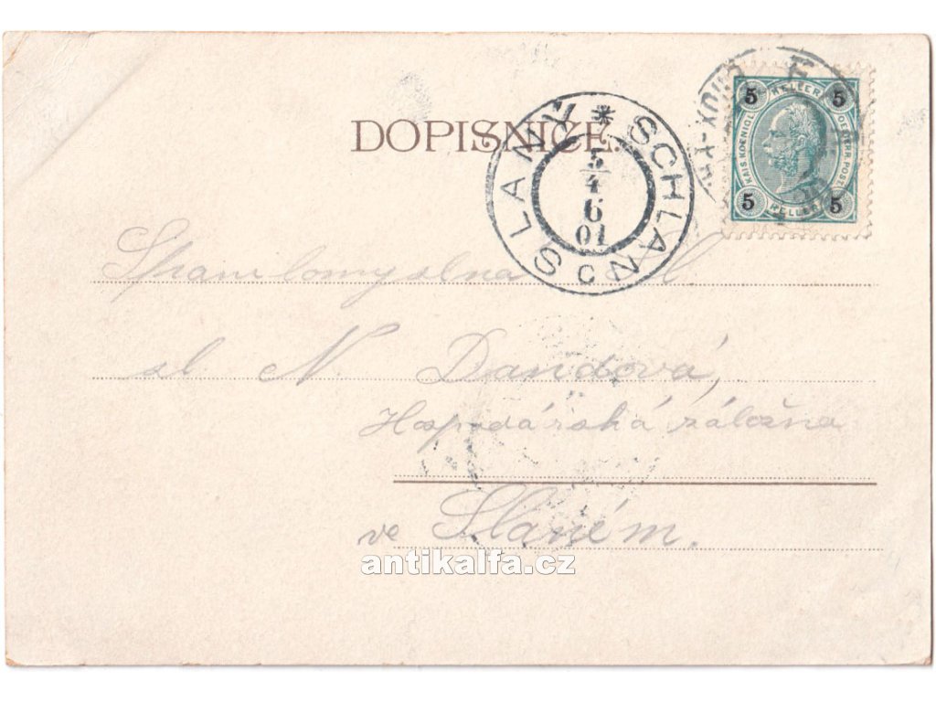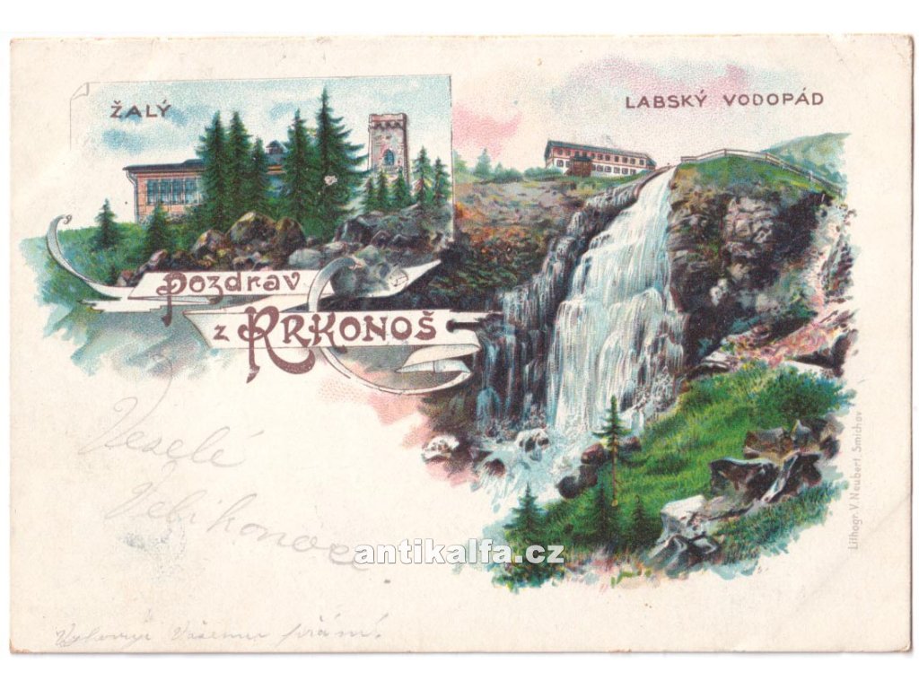 Pozdrav z Krkonoš. Technika kolorovaná litografie. Vydal Neubert V., Smíchov, 1901.