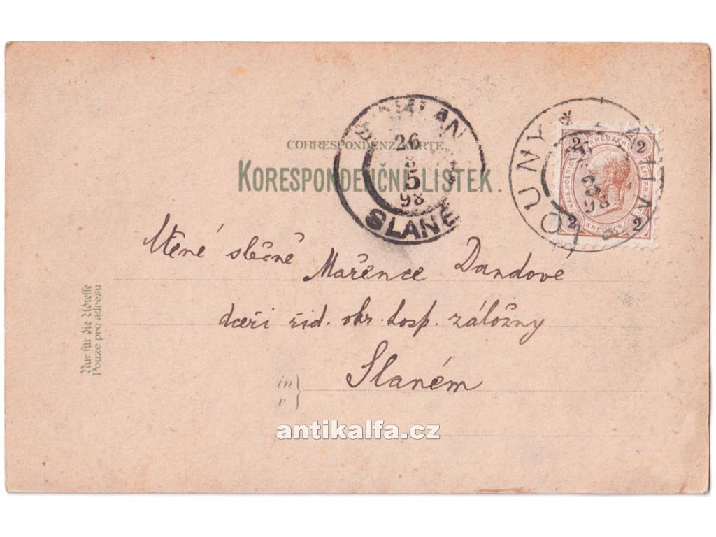 Pozdrav z Loun. Technika kolorovaná litografie. Vydal Schwidernoch Karel, Vídeň, 1898.