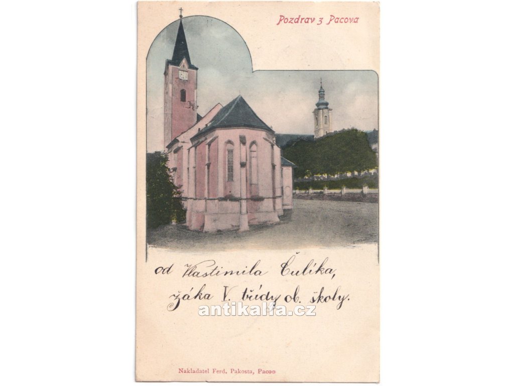 Pozdrav z Pacova. Technika kolorovaný světlotisk. Vydal Pakosta Ferdinand, Pacov, 1901.
