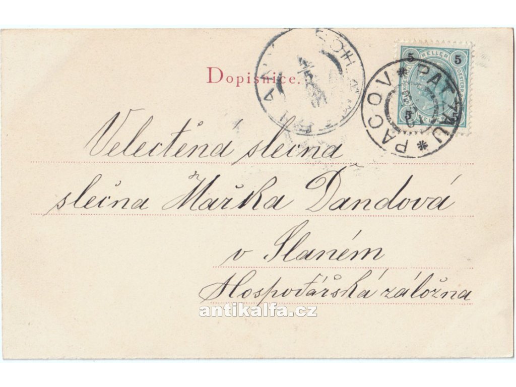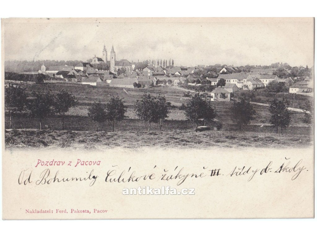 Pozdrav z Pacova. Technika světlotisk. Vydal Pakosta Ferdinand, Pacov, 1901.