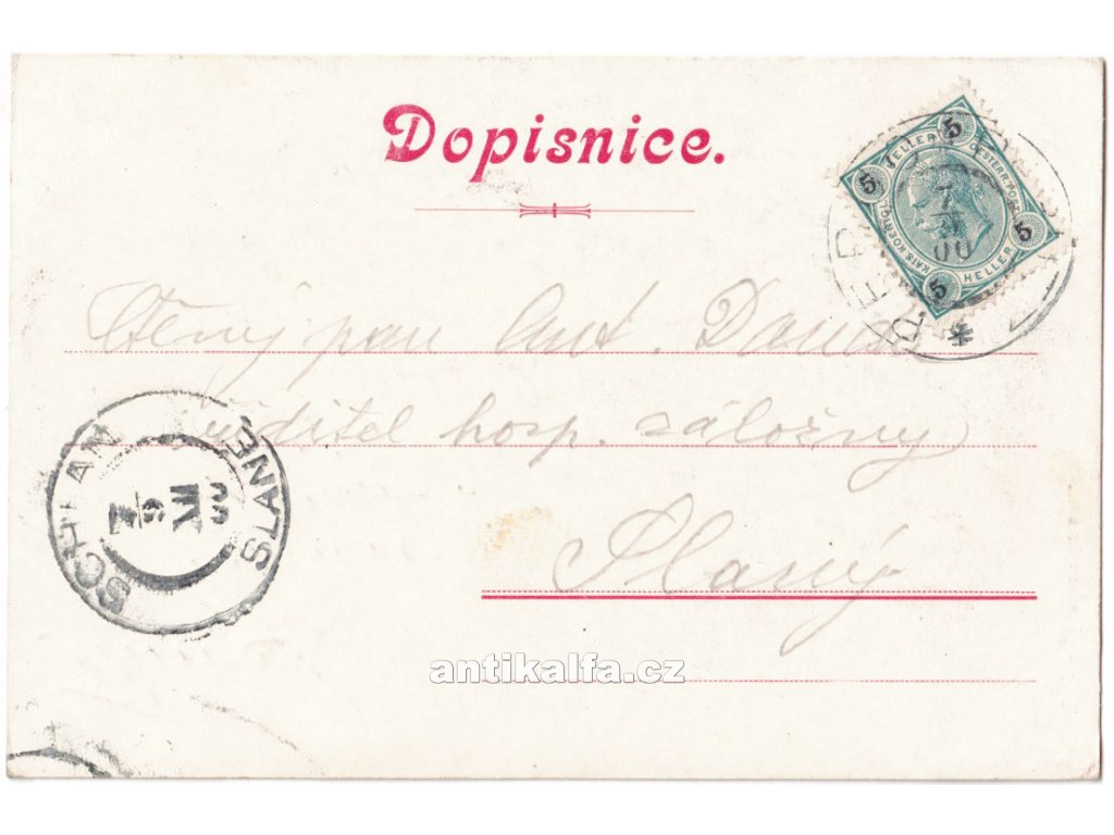 Pozdrav z Peruce! Technika kolorovaná litografie. Vydal Venta Th., Louny, 1900.