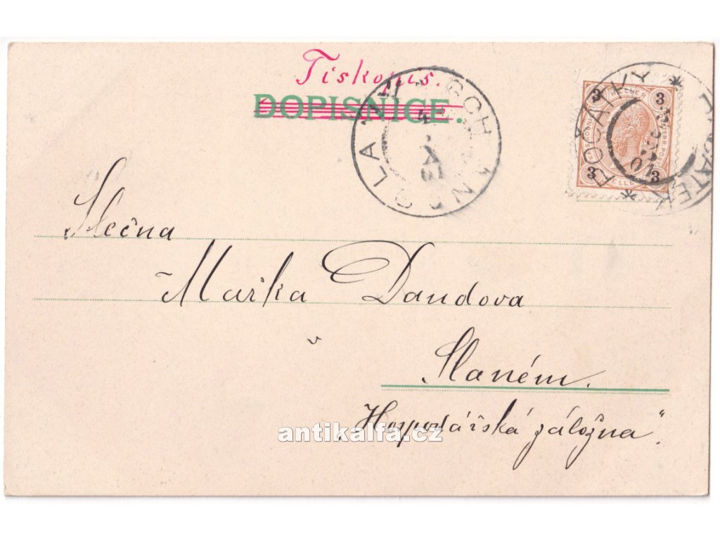 Pozdrav z Počátek. Technika litografie. Vydal Francáno M., Počátky, 1901.