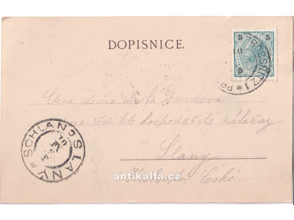 Pozdrav z Prostějova. Technika světlotisk. Vydal Buček F. J., Prostějov, 1901.