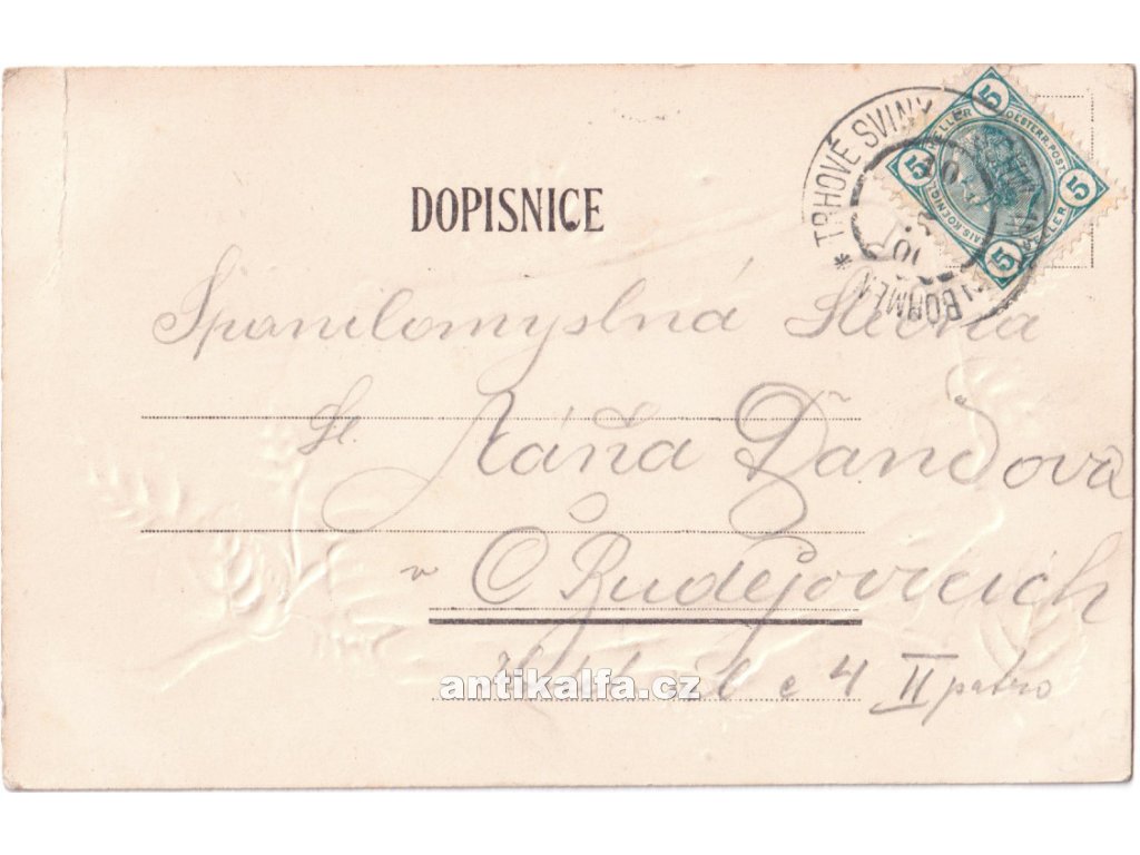 Pozdrav z Trhových Svínů. Technika litografie, koláž. 1902.