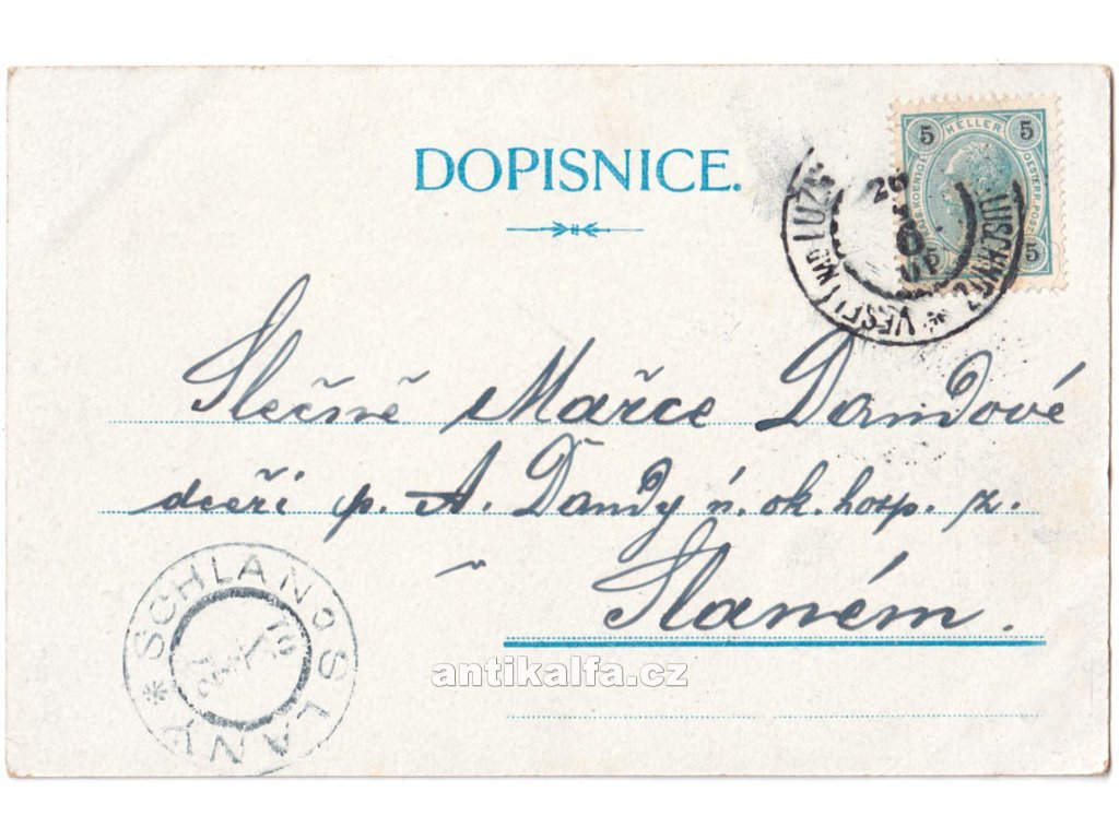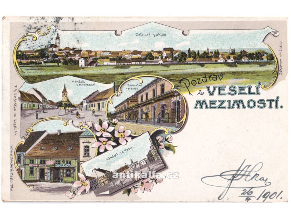 Pozdrav z Veselí Mezimostí. Technika kolorovaná litografie. Vydal Vodrážka A. F., Veselí nad Lužnicí, 1901.