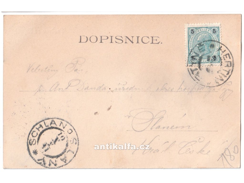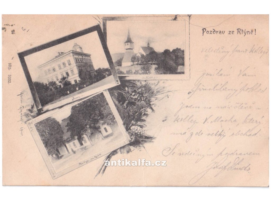 Pozdrav ze Rtyně. Technika světlotisk. Vydal Řezníček Aleš, Úpice, 1901.