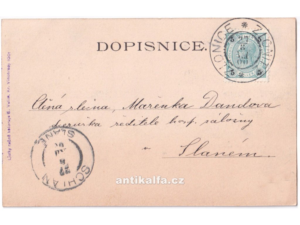 Pozdrav ze Zlonic. Technika kolorovaná litografie. 1901.