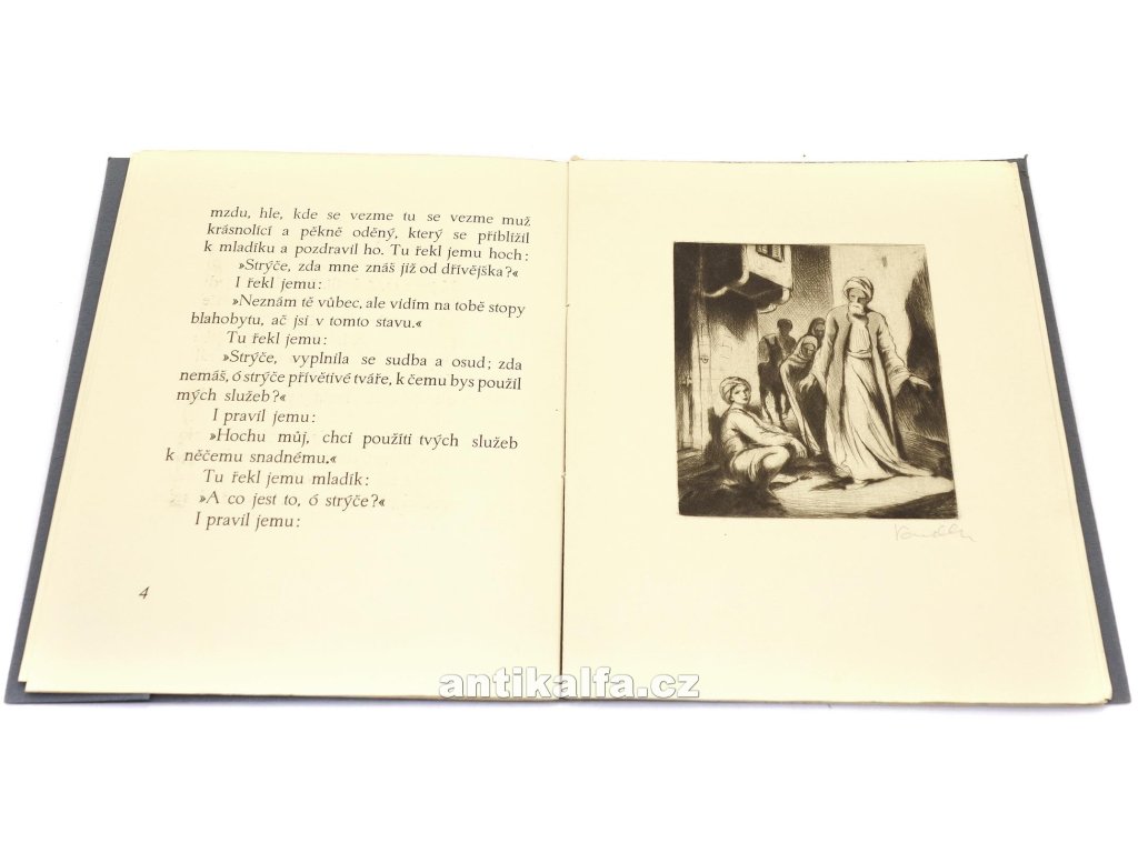 Příběh o jinochu a smutných starcích. Z arabského originálu Tisíce a jedné noci přeložil Karel Šafář. Třemi suchými jehlami a dvěma kresbami vyzdobil František Pavelka, signováno. Vydalo nakladatelství Družstevní práce, České Budějovice 1939.