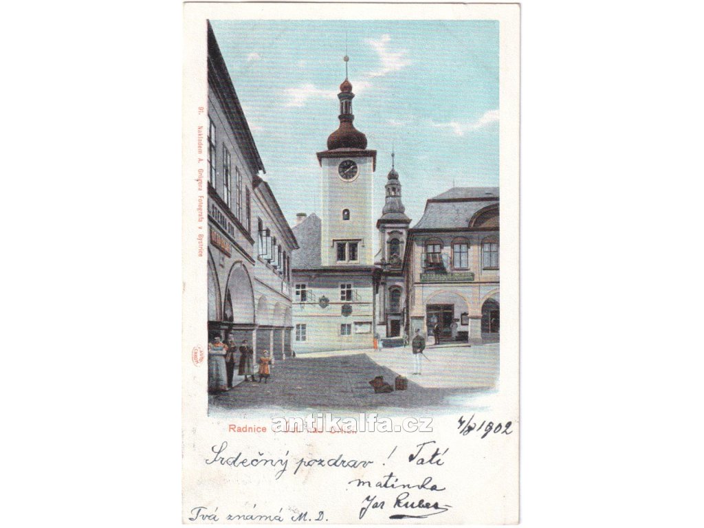 Radnice v Ústí nad Orlicí. Technika kolorovaná litografie. Vydal Gröger A., Bystřice, 1902.