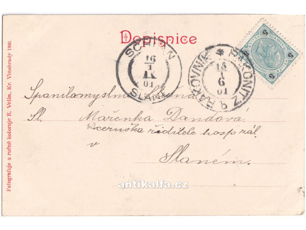 Rakovník. Technika kolorovaný světlotisk. Vydal Velím E., Kr. Vinohrady 1901.