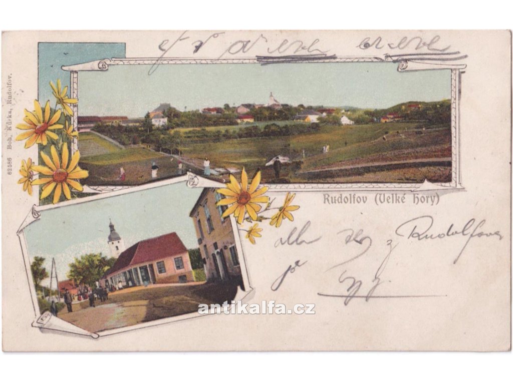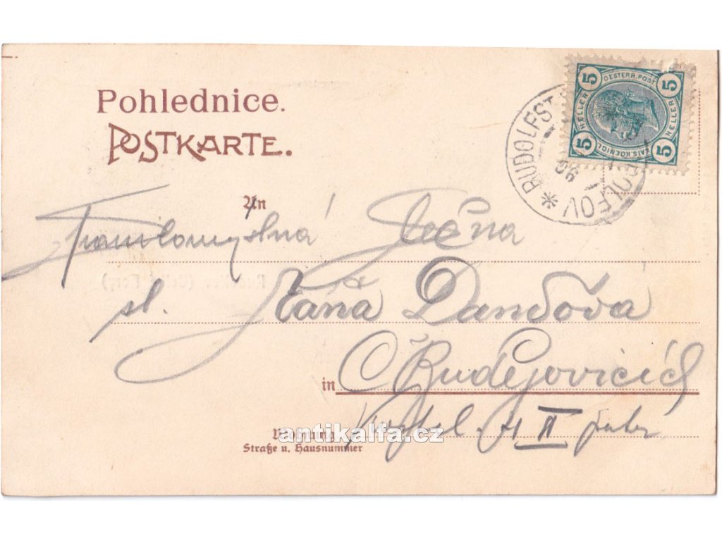 Rudolfov. Technika kolorovaná litografie. Vydal Kůrka Bohuslav, Rudolfov, 1901.