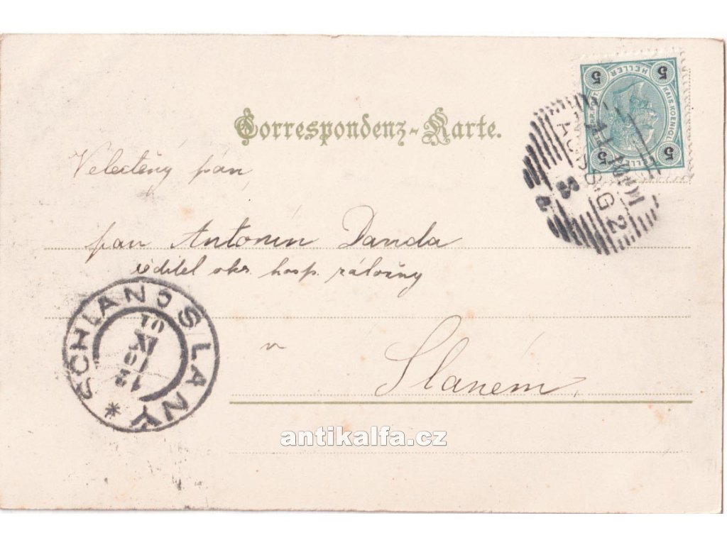 Schreckenstein vom Dorfplatz. Technika kolorovaná litografie. Vydal Brück & Sohn, Meissen, 1901.