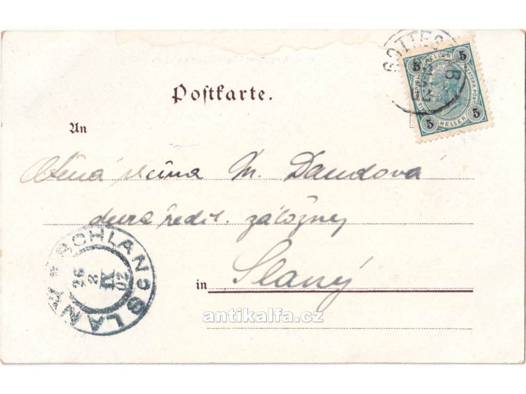 Treudeutscher Gruss von Gottesgab, Erzgebirge: Věrný německý pozdrav z Božího Daru, Krušné hory. Technika kolorovaná litografie. 1902.