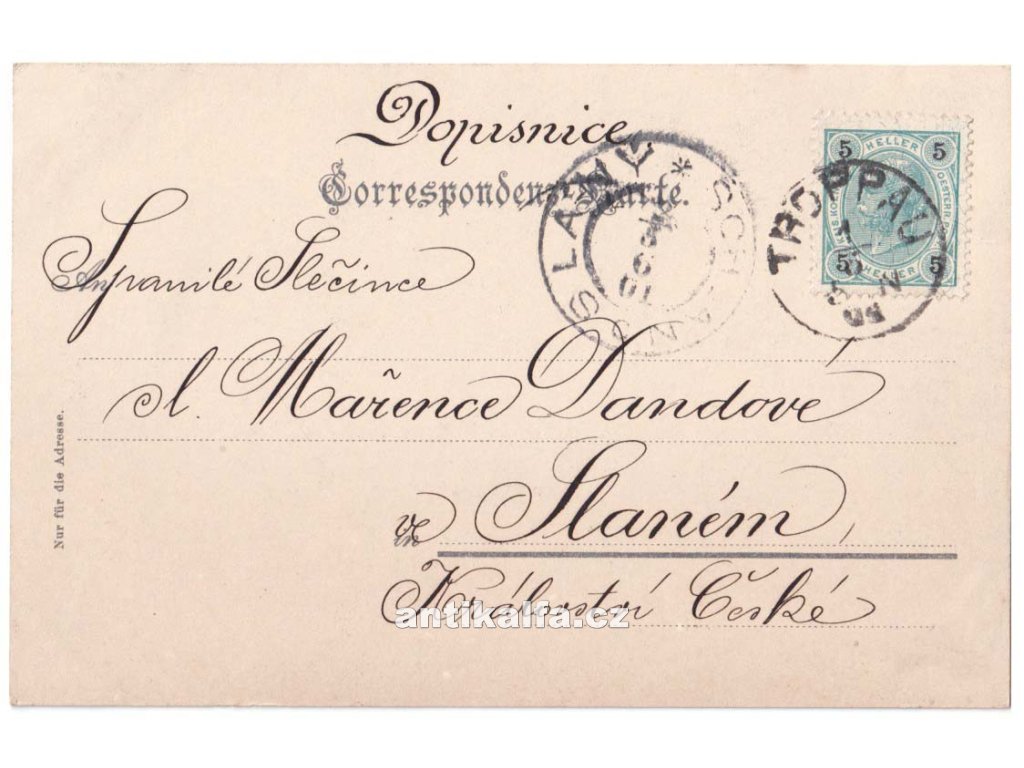 Gruss aus Troppau. Opava. Technika kolorovaný světlotisk. Vydal Rüger C., Wien, 1901.