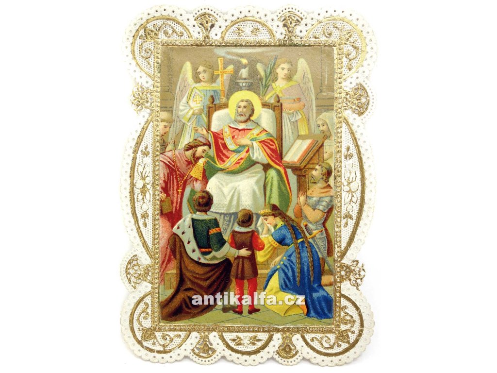 Umírající sv. Methoděj. Litografie aplikovaná na zlacenou krajkovou šablonu.
