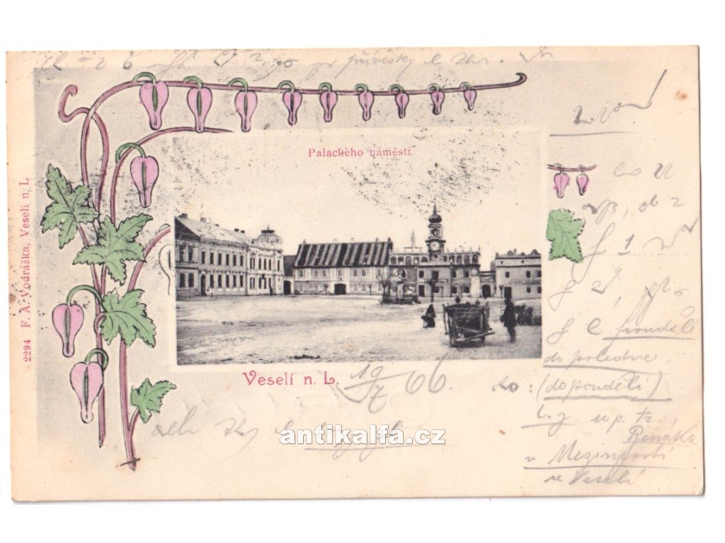 Veselí nad Lužnicí. Technika kolorovaná litografie. Vydal Vodrážka A. F., Veselí nad Lužnicí, 1905.